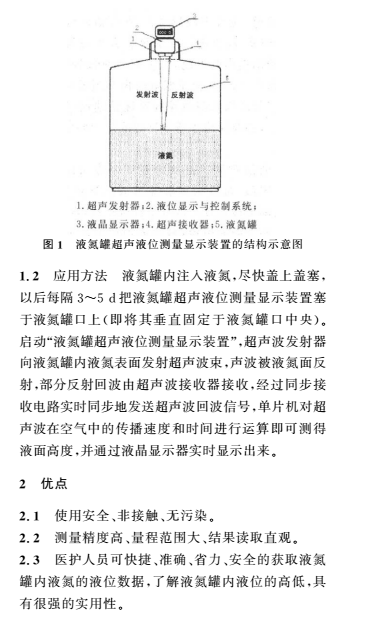 冷凍療法是一種治療疾病的常用方法,臨床主 要用以治療體表的良性或惡性腫物,如疣、黑痣、小 血管瘤、息肉以及宮頸糜爛等。液氮為無色、無臭、 無味的液體,沸點為-196℃,被廣泛的應用于凍存 細胞及皮科、婦科、神經外科等臨床醫學領域。液氮 罐是液氮存儲和運輸的必要設備,液氮在罐內會有 自然消耗。因此,定期檢查液氮損耗是經常要做的 工作,若罐內液氮容量不足總容量的 / 時,應及時 13 補充液氮。目前常用的液氮容量檢查方法有兩種, 一是測量法,取一根長80cm 的木棍,去皮后涂上黑 色,然后自一端開始每隔5cm 設一刻度,測量時,將 零刻度朝下,自液氮罐口插到罐底,經5~10s取 出,結霜的長度即為罐內液氮的液位,此方法既不安 全,讀數誤差又大;二是測重法,先稱出空罐的重量, 再稱出注滿液氮時的重量,然后減去空罐的重量,即 得罐內液氮的總重量,以后每隔3~5d稱一次液氮 罐的重量,這種方法存在費時、費力的弊端。為此, 我們自制了“液氮罐超聲液位測量顯示裝置”,經臨 床實踐,取得了良好的效果。 1 制作與應用 1.1 制作方法 液氮罐超聲液位測量顯示裝置,由超聲波發射器、液位顯示與控制系統、液晶顯示器、超聲波接收器組成。液位顯示與控制系統由超聲發射電路、同步接收電路、單片機連接構成。其外形為瓶塞狀,且適于垂直固定于液氮罐口中央(圖1)。
