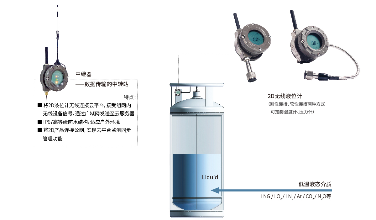 整套系統(tǒng)只通過一套數(shù)據(jù)中繼器及每個液氮罐杜瓦瓶上的無線液位計即可實現(xiàn)多終端的無線上網(wǎng),數(shù)據(jù)互聯(lián).